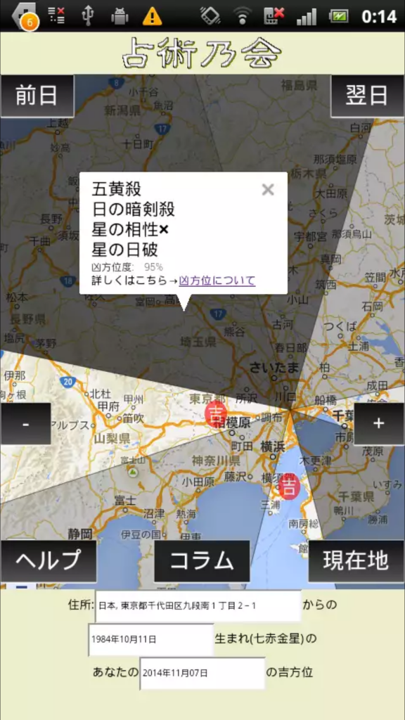 こんな地図が入った画面が登場します! まずは設定です。設定といっても簡単(^^) 住所・生年月日・日付け(自動で今日の日付けが入る)