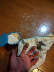 とはいえ、100円商品ですからね(^^)文句の付けようもないでしょう! 写真ではわかりずらいですが結構な光沢が出ています。まぁ~磨いたといっても5~6分でここまで綺麗になれば十分でしょう! ただ、アルミのせいかあっという間に手も真っ黒にそして磨きカスが床に・・これは新聞紙でも下に敷いて作業した方が良いかも!