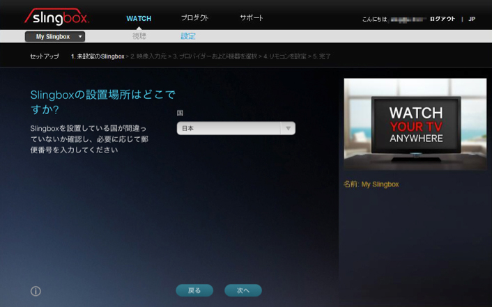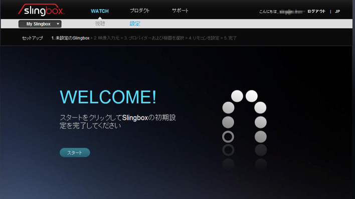 ①この画面になったら左上のSlingbox一覧のタグをクリックして、Slingbox350を選択 ②my Slingboxにカーソルをあわせると”セットアップを起動”が表示され、これをクリックセットアップへ進んでいきます! ③スタートをクリック ④設置場所が「日本」になっていればOk!次へ進んでいきます。