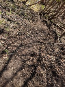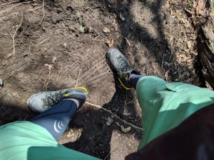 濡れた斜面でブレーキテストです! きちんとグリップしてくれます。 木の根などが出てきても同じようにしっかりグリップしてくれます。 ただ、ソウルが今までの登山靴(ケイランド)と比べると柔らかいため足への負担は多少増えるかもしれませんね! 今回は地表の様子を確認しながら歩ける感じが新鮮でしたけど・・・