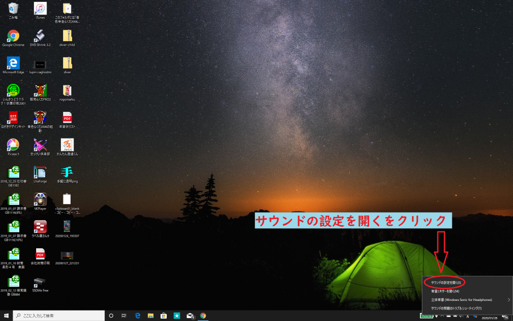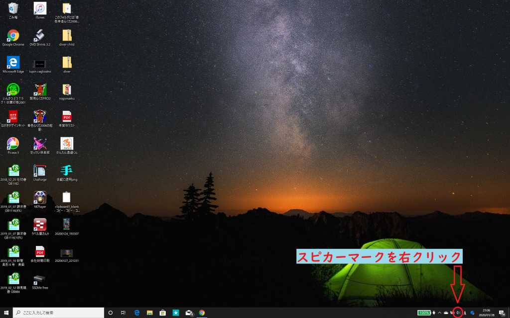 ウインドウズデスク画面…右下のスピカーマークを右クリック!
