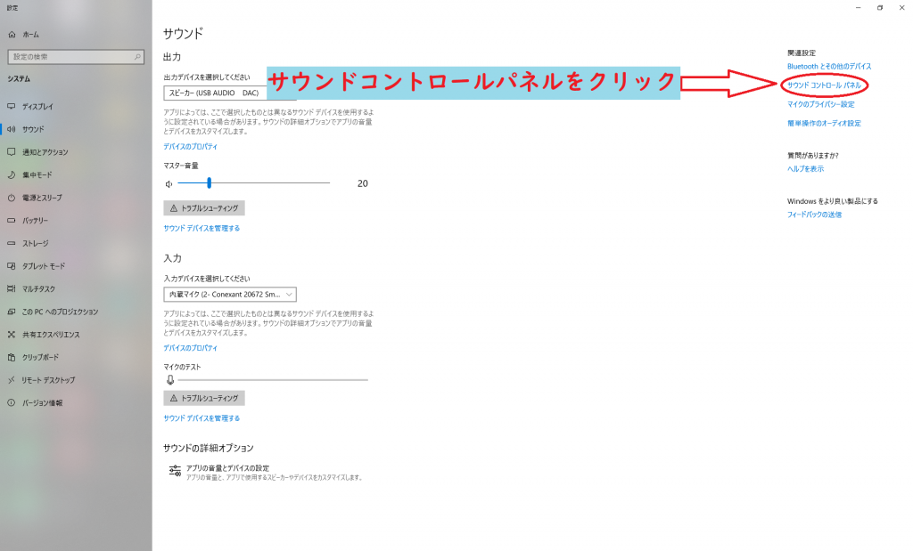 設定画面のサウンドコントロールパネルをクリック