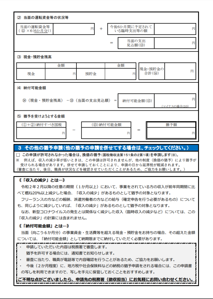 最後に、納税の猶予申請書裏面の3にチェックがあります。これは今回の特例猶予の申請が受けられなかった場合、通常の猶予制度に切り替わるってことらしい!