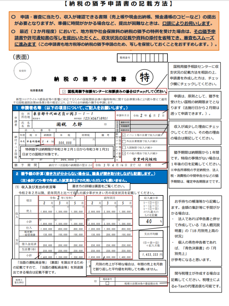 更に、【納税の猶予申請書(特例猶予用)の記載方法】も合わせて見て記入すると漏れなくできそうです。